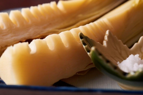 まず最初は、やわらかな姫皮とうるいの酢の物。掘りたての孟宗だからこそ味わえる、みずみずしくやさしい甘みです。姫皮は皮つきで茹でるからこそ食べられる部分です。