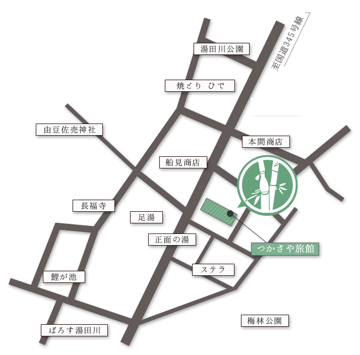 鯉が池- 昔は池いっぱいに水蓮の花が咲いていたことから「水蓮の池」と呼ばれていました。現在は、防火用水として利用されており、泳ぐ鯉たちにエサを与える湯治客の姿も見られます。
